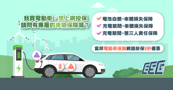 台灣電動車市場持續成長,富邦產險響應此趨勢推出網路投保「電動車專屬保險」S、M、L三種方案,三種方案均增加承保「車體損失險-電池自燃保障」、「車體損失險-充電期間保障」以及「第三人責任險-充電期間保障」,以多元方案降低意外發生時的財務負擔,提供最貼近車主需求的完善保障