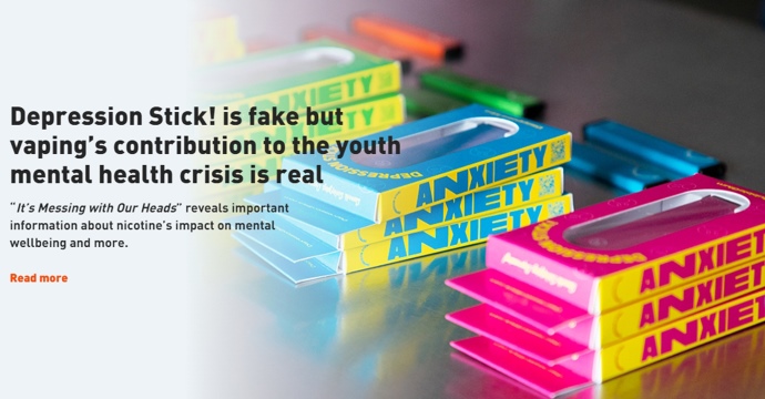 反菸組織「真相倡議」戳破菸商隱匿加味電子煙加重危害青少年身心健康的事實,以反諷方式強調「加味電子煙其實就是調味的憂鬱棒,吸了以後不但不會解憂、不會快樂,更會讓人憂鬱症風險增兩倍、感到焦慮、過動!