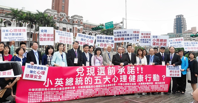 由台灣精神醫學會、中華民國諮商心理師公會全聯會、中華民國臨床心理師公會全聯會、中華心理衛生協會及董氏基金會5個民間團體,共同發起「心理健康促進建言」給蔡英文總統,並獲得64個團體代表支持,前往總統府拜會陳建仁副總統,呼籲政府應正視心理健康議題。
