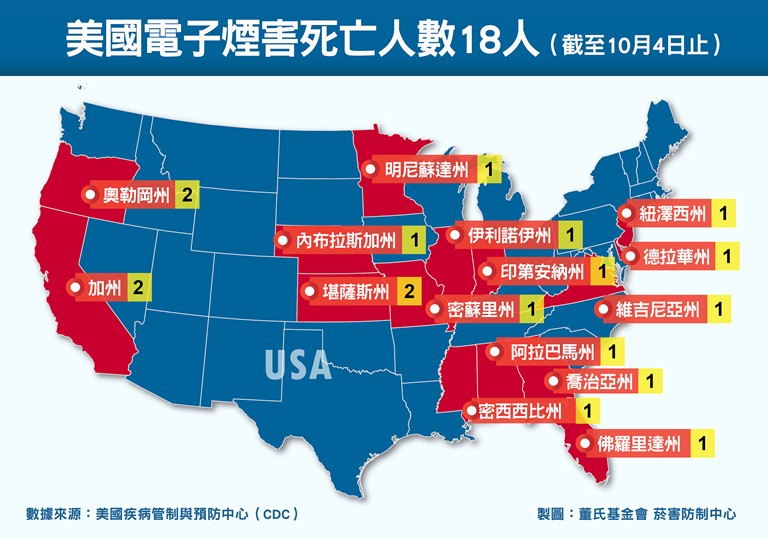 今早(10月4日)美國CDC再發布最新電子煙嚴重肺病疫情報告,繼上週(9月27日)12人死亡後,最新死亡人數累計至18人,且各州通報病例從805件直接破千,已達1080人,範圍更橫跨全美48州!