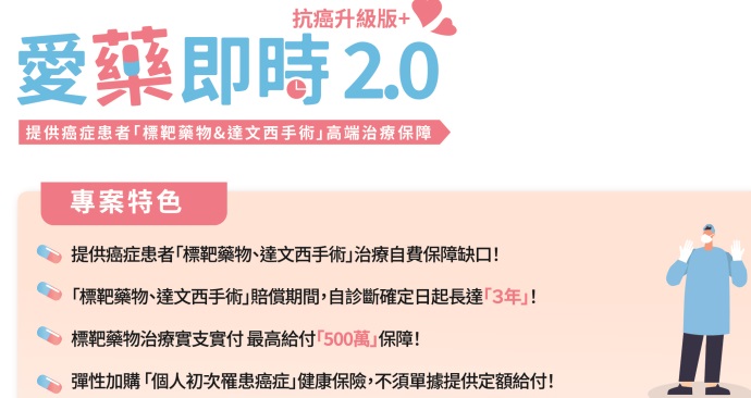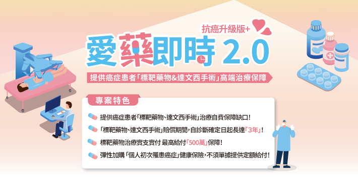 每4分20秒就有1人罹癌,微創手術及標靶藥物治療都需要實支實付型醫療險來分擔費用,僅有健保於癌症治療時明顯不足。富邦產險「愛藥即時2.0」癌症險,是市場首張「標靶藥」結合「達文西手術」的保險,提供雙重實支保障。標靶藥保險金最高500萬元,賠償期間達3年,不妨檢查自己的癌症險是否足夠。