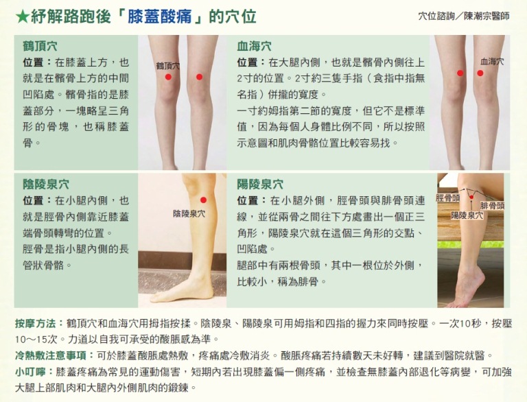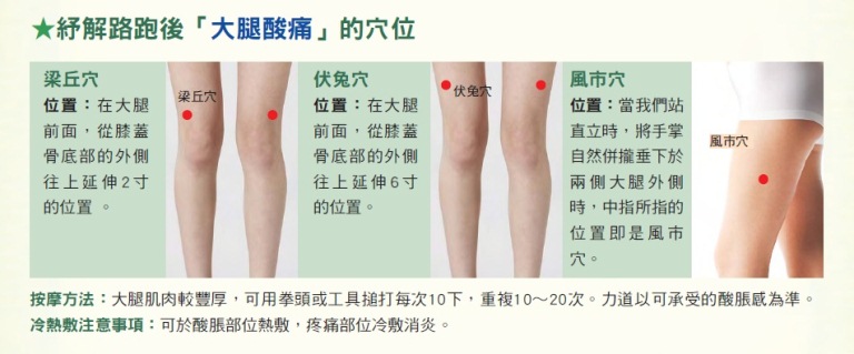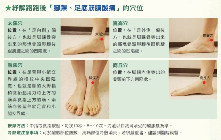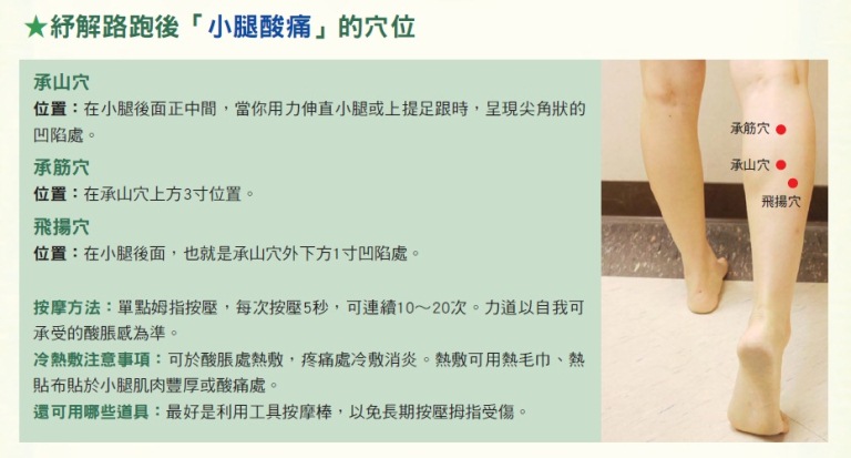 台灣基層中醫師協會理事長陳潮宗提醒,跑步前記得做一些伸展大小腿肌肉、膝蓋、腳踝等部位的拉筋熱身動作,萬一路跑後腿足酸疼,可按摩以下穴道,紓解乳酸堆積引起的酸痛。但若按壓穴道及冰熱敷後,酸脹、疼痛感數日仍未好轉,建議盡快至醫院就醫。