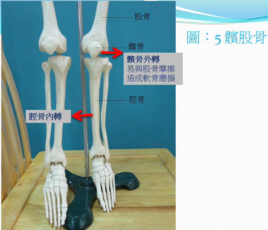 台中澄清醫院中港院區復健治療部主任蔡永裕說明,腳踩下去時足弓往下壓,會造成小腿脛骨內轉,膝蓋的髕骨往外轉,髕骨外轉時,會與大腿的股骨摩擦(如圖),若頻繁摩擦,易使膝蓋的髕骨與大腿股骨交接處的軟骨磨損,產生發炎反應。