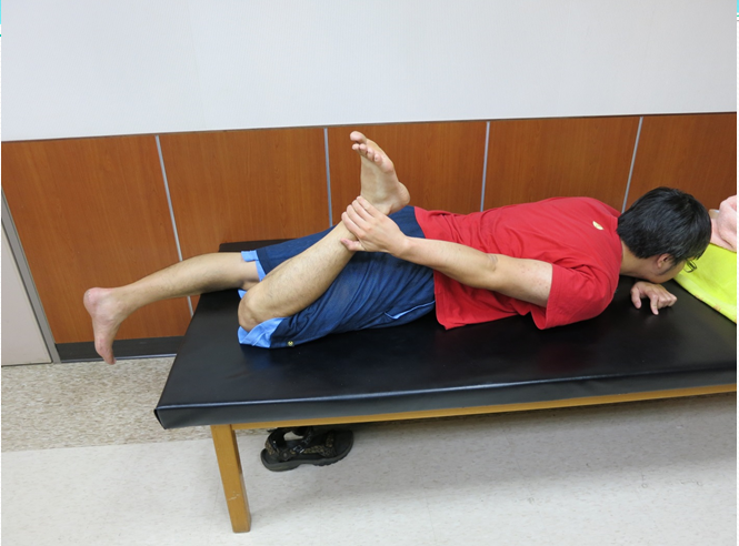 步驟1》身體趴著,有膝傷的腳往後彎曲,用同側手抓住腳踝處。