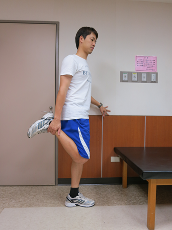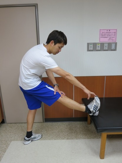 - 左腳站立,右腳放在桌椅上,右腳上勾,以右手抓住右腳腳尖,如此停止15〜30秒,伸展腿後肌。