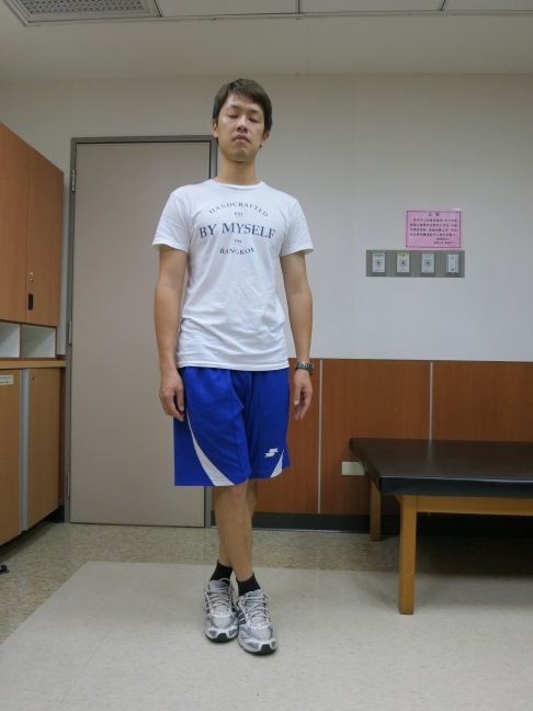 - 站直,右腳在前,左腳在後,呈交叉狀。