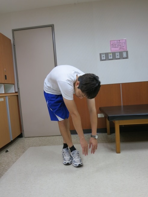 - 身體向下彎曲,雙手往下,彷彿要摸右腳,身體彎下程度以自己能做到為準,不須勉強,此動作停留15〜30秒。