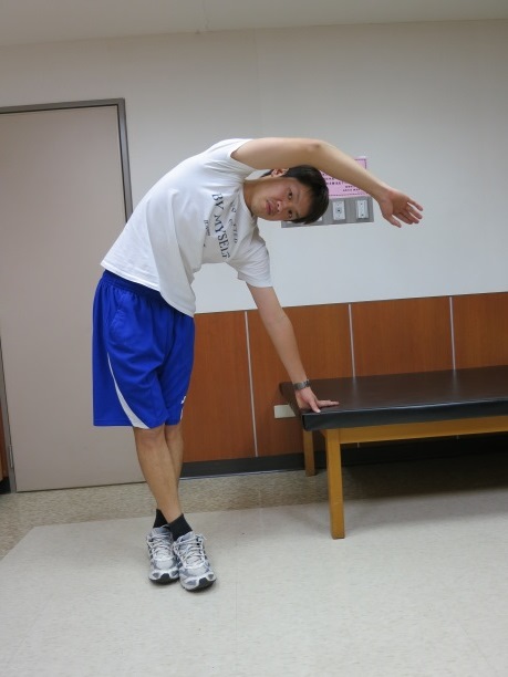 - 身體往右側彎曲,感覺側邊身體被拉緊,如此停留15〜30秒。