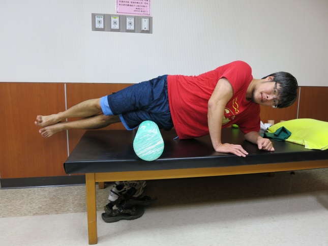 1.側躺,將泡棉滾筒放在大腿外側下方。