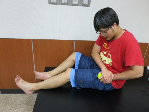 3.當逐漸習慣和掌握泡棉滾筒的強度,也可將泡棉滾筒替換成網球或棒球,將球置於大腿外側,來回滾動。
