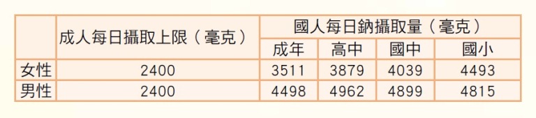 世界衛生組織(WHO)2013年建議,成人每日鈉攝取量應小於2000毫克;2歲以上兒童則依體型、年齡和熱量需求,參照成人攝取限量再酌減;但現代青少年和學童愈吃愈鹹,鈉攝取量甚至比成人還高。