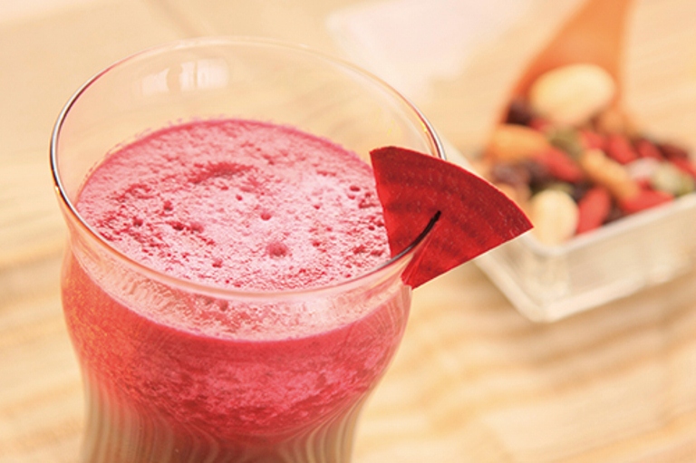 材 料:苜蓿芽10g、豌豆苗10g、甜菜根50g、鳳梨200g、蘋果1顆、綜合堅果1大匙、大豆胜肽1大匙、冷開水350c.c.