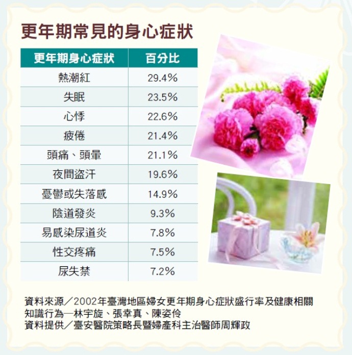 其實,更年期後的陰道乾澀、頻尿,都是女性荷爾蒙缺乏所導致。台灣婦產身心醫學會理事長、臺安醫院策略長暨婦產科主治醫師周輝政說明,一般人熟知的更年期症狀──熱潮紅、心悸、盜汗、失眠,與荷爾蒙不穩定有關,常發生在尚未完全停經的「更年期前期」。