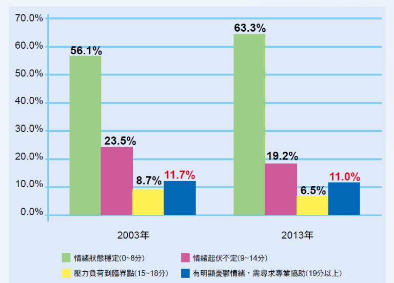 這二次調查均以董氏基金會「臺灣人憂鬱症量表」測量民眾憂鬱程度,結果顯示:2003年受訪者中,「有明顯憂鬱情緒,需尋求專業協助(包括諮商、醫療)」者占11.7%,2013年則有11.0%。進一步分析,無論2003年或2013年,女性「有明顯憂鬱情緒,需尋求專業協助(包括諮商、醫療)」比例均高於男性,且達顯著。