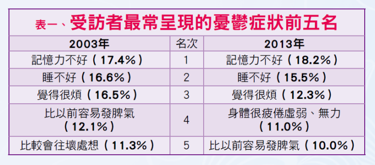 從調查資料顯示,無論2003年或2013年,受訪者最常呈現的憂鬱症狀前三名,均為「記憶力不好」、「睡不好」、「覺得很煩」。在臨床診斷上,這也是民眾較易自我覺察的層面──不佳的「睡眠狀況」及負向思考。