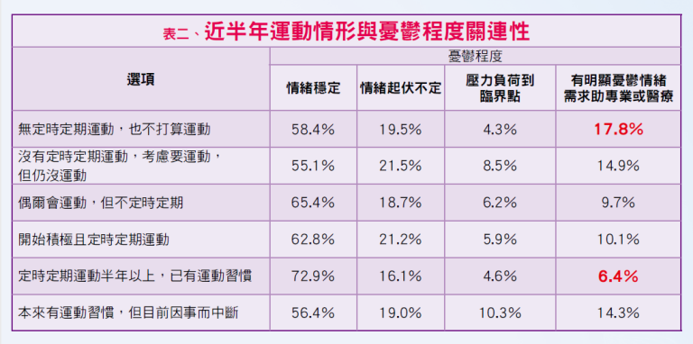 深入探討紓壓方式是否確實改善憂鬱情緒,以2013年調查為例,受訪者定時定期運動半年以上,已有運動習慣,僅有6.4%的受訪者「有明顯憂鬱情緒,需尋求專業協助」,反之,無定時定期運動,也不打算運動者,17.8%的受訪者「有明顯憂鬱情緒,需尋求專業協助」。證實「運動」確實能有效改善憂鬱情緒。董氏基金會鼓勵大眾將運動視為自己的紓壓方式,透過運動過程中,大腦產生的腦內啡、正腎上腺素及血清素,可以幫助我們改善情緒,產生愉悅的心情。