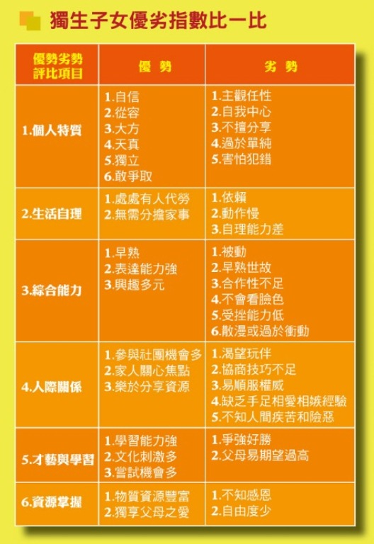 總之,獨生子女的優、缺點互為表裡,父母愛孩子要愛得理性、愛得有技巧,善用機會教他們體認幸福,進而學習感恩與付出,才能培養孩子適應未來的能力。