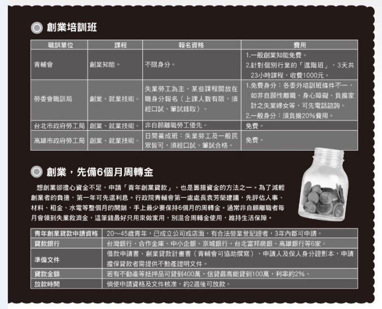 創業前,需先擬訂計劃書、自我評量、同時弄清楚工商登記、行銷及法律等問題,這類「創業知能」可向「青輔會」尋求協助。若是「創業技術」的培養,如:學習烹飪、美髮美容、多媒體設計、單車修理等,可至「勞委會職訓局」查詢委外職訓班開課時間、所需費用。