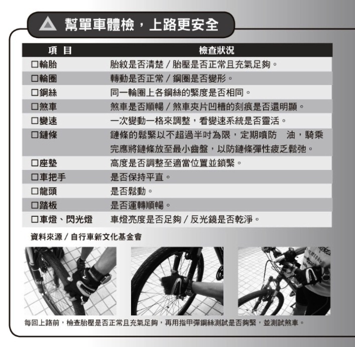 在單車事故中,致命的關鍵在於「頭部受創」,有十多年騎單車經驗的自行車新文化基金會專員林惠忠強調,安全帽是絕對必備的配件,每次騎乘都應正確穿戴。包括在頸項間的頤帶扣和兩側耳垂下方的調節扣要調整固定,避免容易脫落;帽子前緣要下壓與眉齊,避免前額撞地時沒被完全保護。