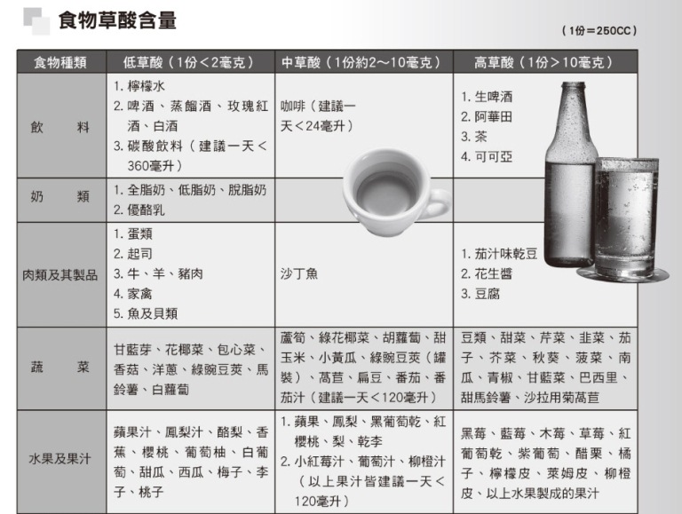 少吃或避免一次吃太多草酸含量高的食物,像茶、咖啡、可樂、菠菜等,同時避免攝取過多含維生素C的食物,且每日飲食中所含的草酸攝取量最好小於50毫克,例如:菠菜一天攝取量少於100公克,牛奶一天1~2杯(1杯=250cc)、肉類3份左右,主食類含草酸不高,較不限制。