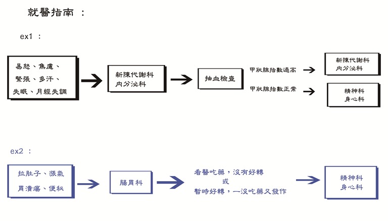 「我到底得了什麼病,為什麼都治不好?」這問題一直困擾著怡伶。自己上網找資料,發現甲狀腺亢進,也可能有心悸、易怒、月經不順等症狀,覺得跟自己的情形吻合極了,於是又滿懷希望地去新陳代謝科報到。抽血驗了甲狀腺指數後,未發現異樣。新陳代謝科的醫生建議她回去看婦產科。怡伶沮喪極了,到底身體出了什麼問題?接下來又要看哪一科?