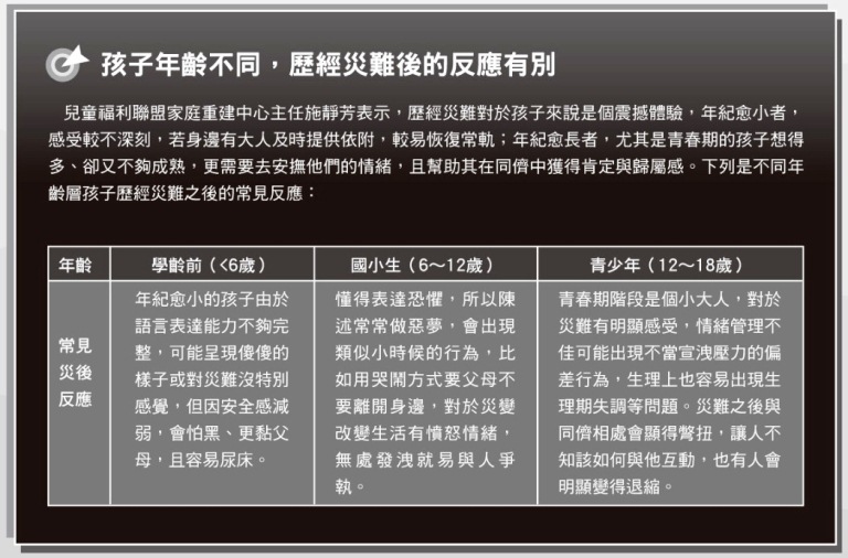 關懷921地震134位未成年失依孩童至今的兒童福利聯盟家庭重建中心主任施靜芳表示,除了襁褓中嬰兒因年紀太小,可能沒有認知到災難,多數歷經災難的孩童都會產生創傷症候反應,比如反應呆滯、容易感覺害怕、出現尿床與吸吮指甲等退化行為、睡不安穩或不願意起床面對,也有不少孩童急著想趕快回學校、找同儕陪伴。