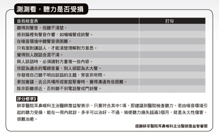 長期處在噪音環境,會逐步耗損聽力,但也有可能是短時間內聽力突然喪失。曾有家庭主婦一早起床,突然聽不太清楚女兒叫她的聲音,心想,應該只是感冒、一時耳鳴。不過,下午去銀行辦事,突然間,她又聽不見銀行人員的聲音,整個耳朵嗡嗡作響,她看狀況不對趕緊去醫院就診,醫師診斷為「突發性耳聾」,幸好及時治療,聽力恢復良好。