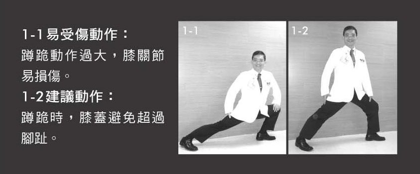 1-1易受傷動作:蹲跪動作過大,膝關節易損傷。