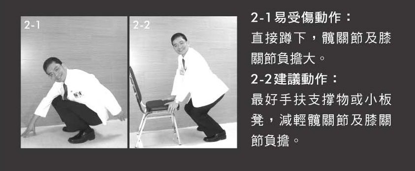 2-1易受傷動作:直接蹲下,髖關節及膝關節負擔大。