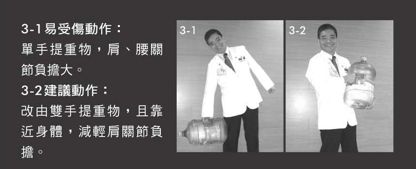3-1易受傷動作:單手提重物,肩、腰關節負擔大。