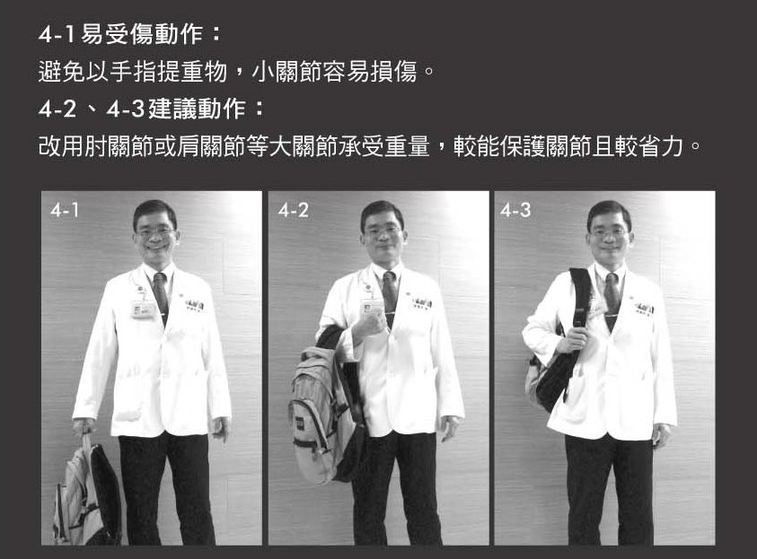 4-1易受傷動作:避免以手指提重物,小關節容易損傷。