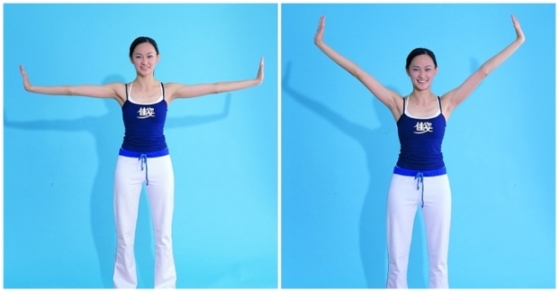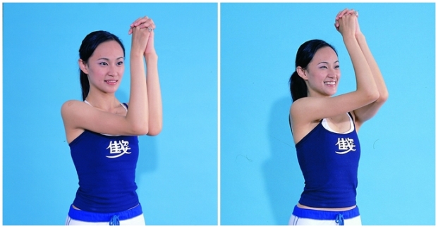 預備姿勢:站姿,雙手互握,手臂伸直抬舉至頭頂。
