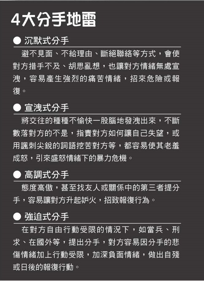 分手暴力事件除了讓我們驚怖、嘆息外,更提醒我們,這不僅是一段關係的結束,更需用心、謹慎處理。