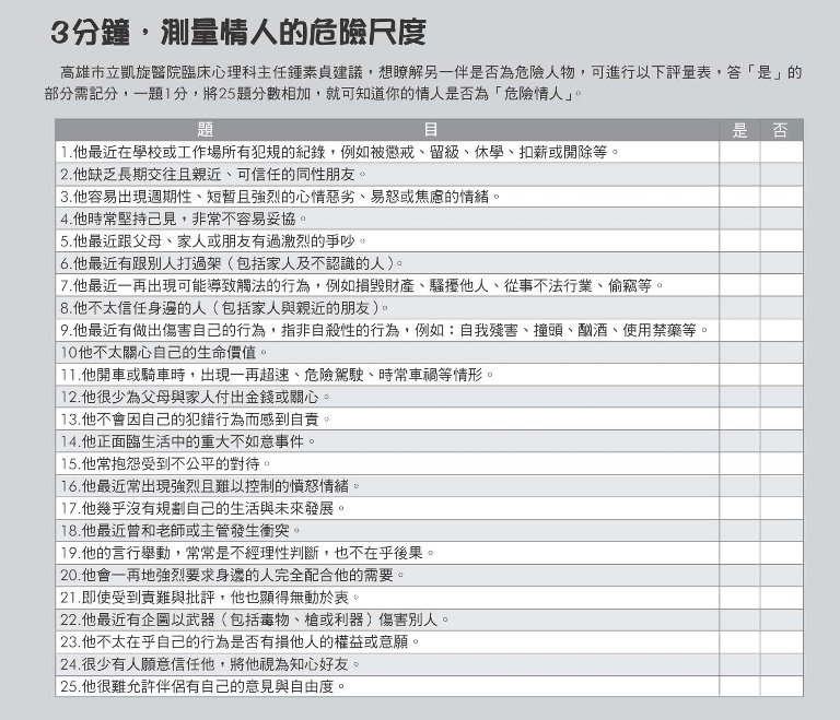 想瞭解身邊的情人是否具危險性?這問題可透過日常生活的觀察窺見端倪。情緒不穩定、人格不成熟或性格違常,通常會在生活細節和應對進退中,不自覺表現出來。
