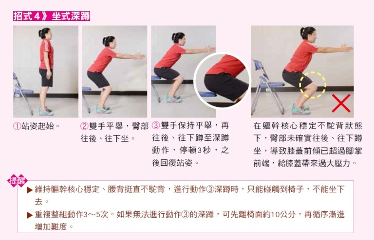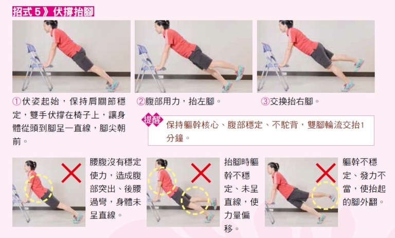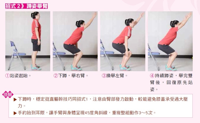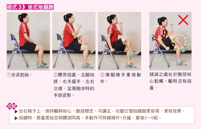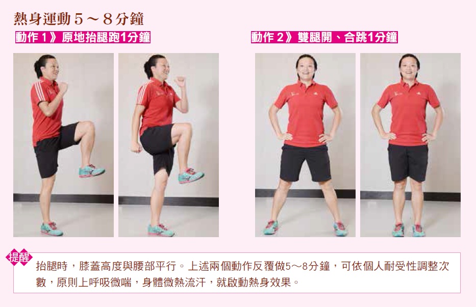 力格運動健護中心教練吳文郁建議,以下每組運動做1分鐘或反覆進行3~5次,可視個人體能調整次數,一開始速度不用快,主要是做好每個動作,熟悉後可逐漸加快,暖身加主訓練全部完成的時間約20~30分鐘。原則上,「有點喘」、「有點痠」開始有效;想進階者,可用自身能承受的最快速度、每組做5次,達到最佳效果。