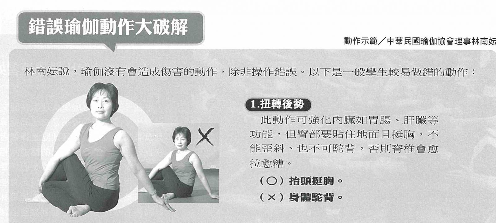 林南妘說,瑜伽沒有會造成傷害的動作,除非操作錯誤。以下是一般學生較易做錯的動作: