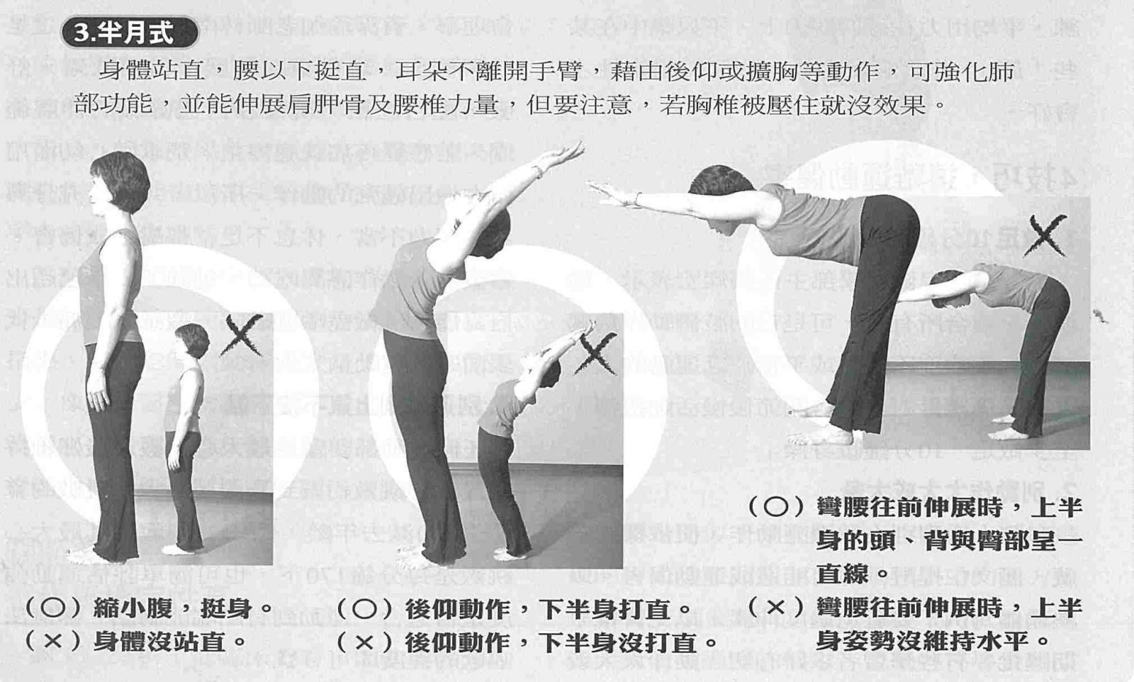 身體站直,腰以下挺直,耳朵不離開手臂,藉由後仰或擴胸等動作,可強化肺部功能,並能伸展肩胛骨及腰椎力量,但要注意,若胸椎被壓住就沒效果。
