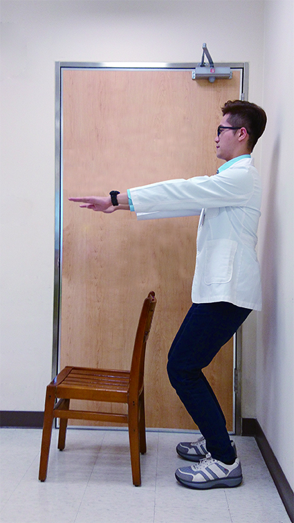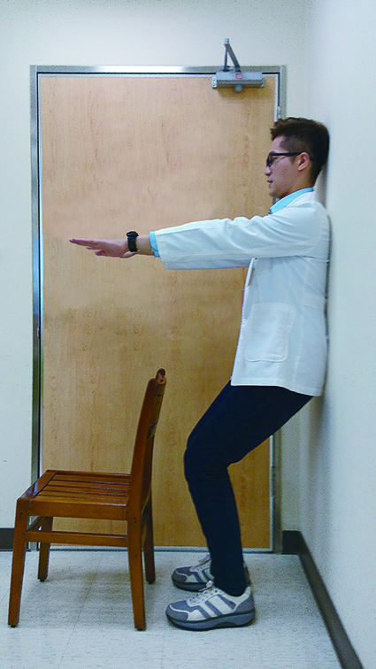 動作1:「靠牆」蹲停30秒~1分鐘。
