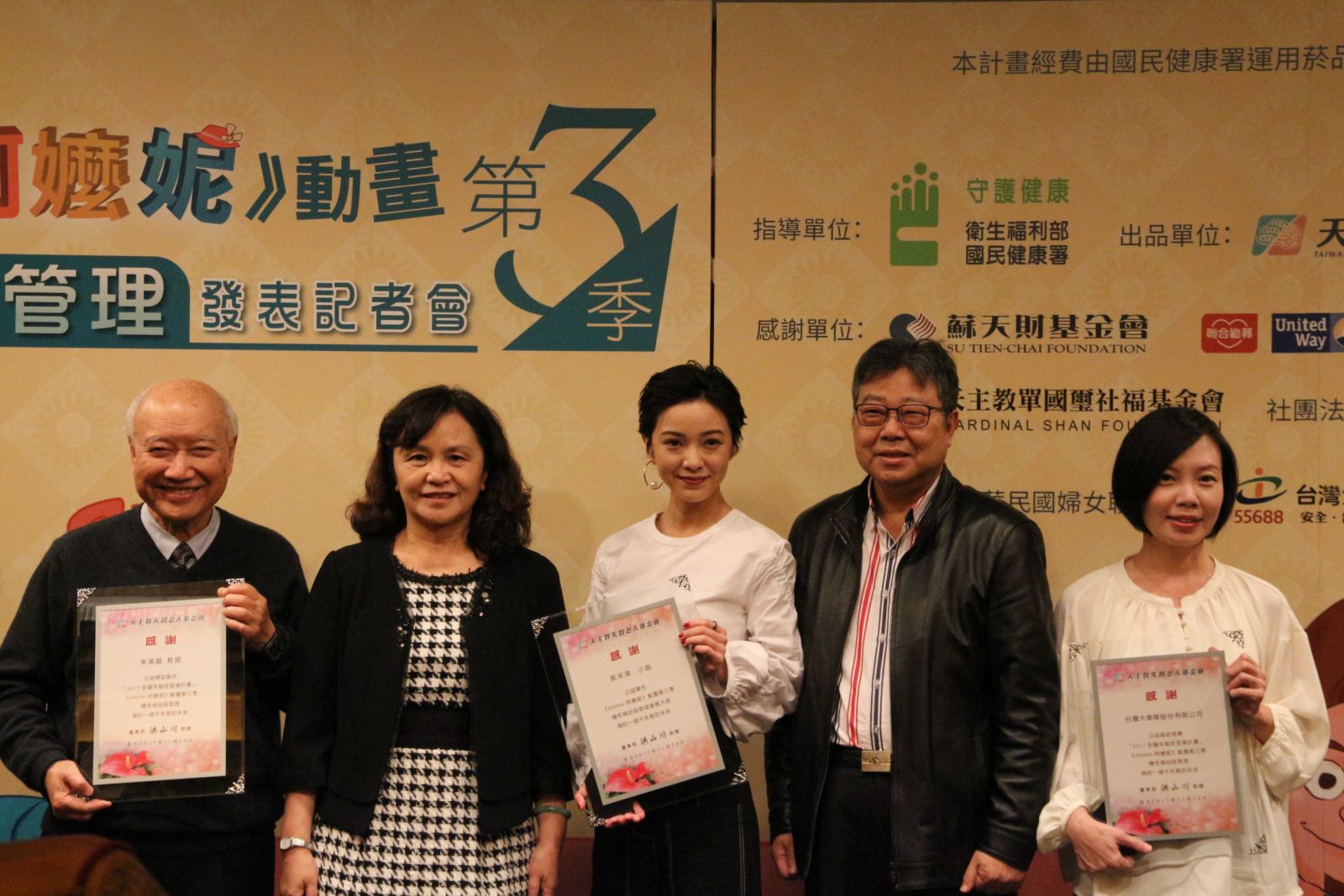 《AMANI阿嬤妮》第三季動畫記者會活動,朱英龍教授、衛福部國健署游麗惠副署長、慢性病自我管理衛教大使郭采潔、天主教失智老人基金會會鄧世雄執行長及台灣大車隊黃盈慈經理一起呼籲注意慢性疾病,預防失智症。