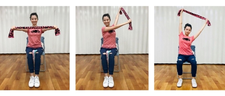 先將毛巾撐開,雙手握住毛巾兩端往上抬,呈現大V字形,接著挺直腰桿、往左邊伸展,再繞過頭頂從上往下、依順時針(或逆時針)方向劃過,左右各一次。待伸展完肌肉、做完暖身操後,再做肌力訓練。