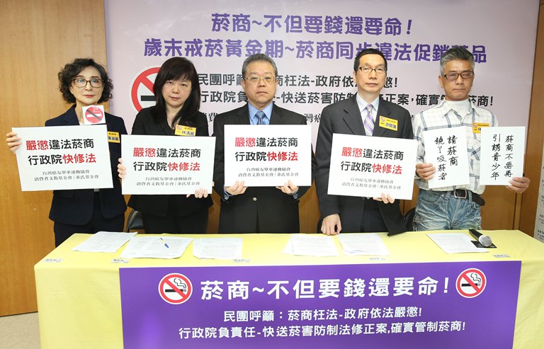 消費者文教基金會董事長游開雄補充,世界衛生組織曾指出,每2個吸菸者中將有1人會死於菸害。現在澳洲政府更指出是3個吸菸者中就有2人會死於菸害。菸品是一個特殊商品,所以《菸害防制法》才會規定不可以廣告促銷,但現在菸商卻變本加厲違法。當然不應該只處500萬元的最低罰款,而是每一個品項處2500萬元罰款,所以43個品項應處10.75億元罰款,對一年在台灣營業額約2000億元的菸商們而言根本是小零頭。