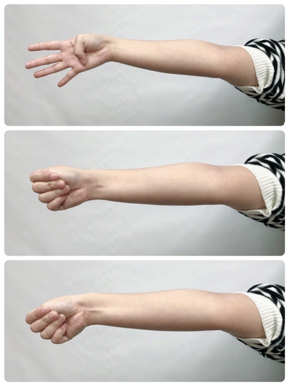 把拇指用四根手指頭包起來,呈拳頭狀,並垂直往前伸,和身體呈90度,注意手腕要伸直。接著手腕出力,把包住大拇指的拳頭往小拇指的地方彎一下。(可參考下圖)若彎的時候,感覺拇指靠近手腕的地方有酸酸、緊緊、痛痛的感覺,就是「媽媽手」!