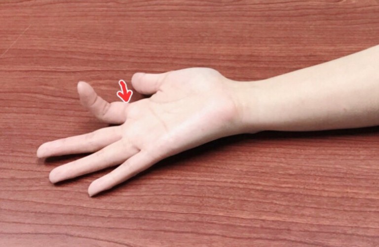 板機指是手掌及手指交接處筋結突出,建議可將手背貼著桌面平放,再把手指向上彎曲後,每個手指皆可輪流照做。若掌心與指關節相接處(如下圖箭頭處)出現疼痛感,就可能有「板機指」,建議及早就醫。