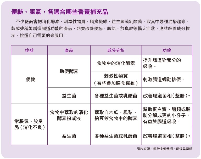 如果標榜改善便祕的產品有添加「膳食纖維」,但水喝得不夠,容易使便祕變嚴重,反而肚子痛;若沒有添加,只有消化酵素與刺激性物質,糞便的分量不夠,不一定能順暢排便,若選用這種配方,就要同時補充足夠的膳食纖維及水。