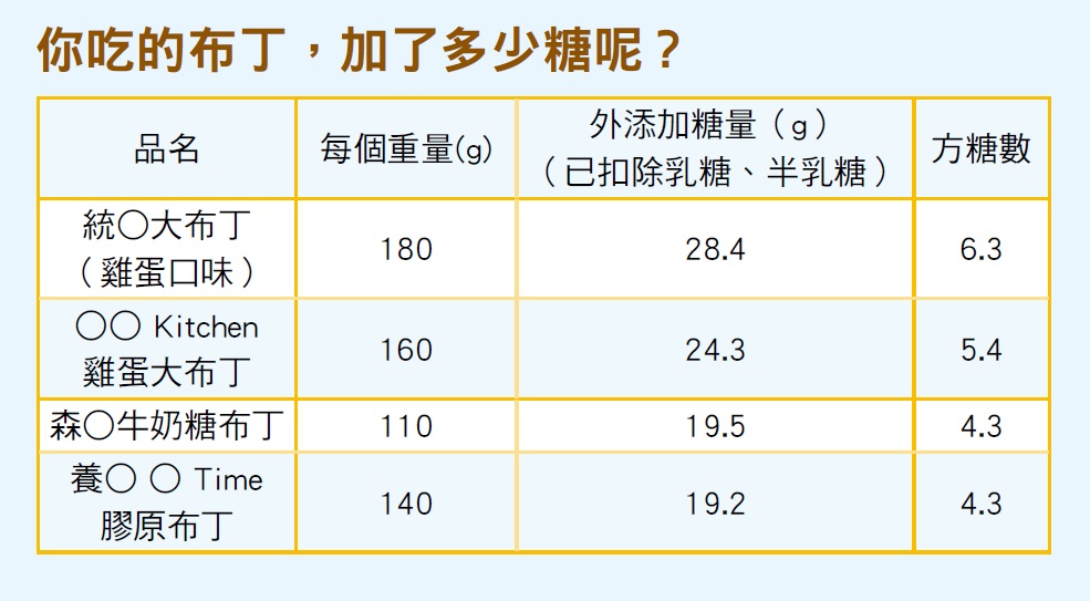 董氏基金會食品營養中心於2016年4月~7月間在各大超商及賣場調查市售14件布丁產品,發現其添加糖量大多超過15克/100克,添加糖量最高的產品竟含28.4克糖,等於吃進約6顆方糖,接近喝1杯含糖飲料!再仔細檢視食品標示,其中有7款布丁的成分標示依序為:水、蔗糖、奶粉(乳粉)等,表示糖的用量是第二多!