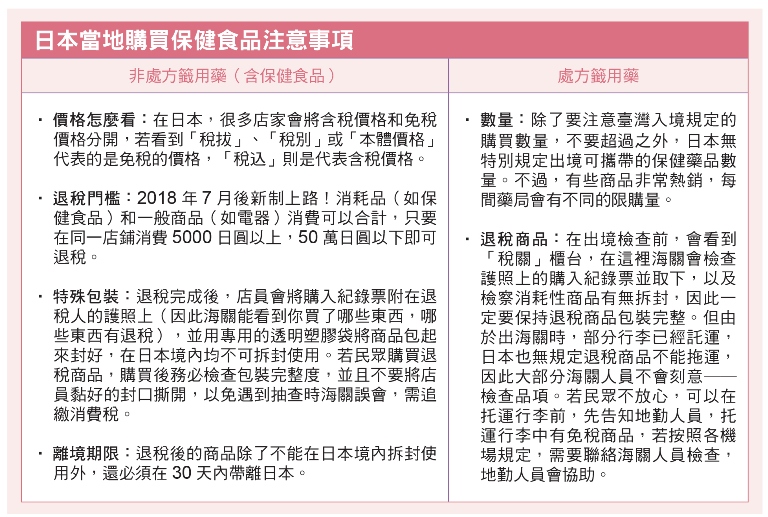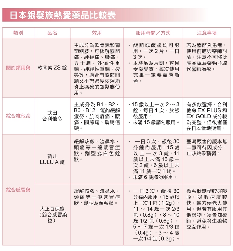 日本保健藥品百百種,不只年輕人愛買,許多樂齡族和銀髮族也喜歡赴日購買保健品,認為品質高又有效。對此,微笑藥師藥局廖偉呈藥師說,無論是線上諮詢還是店面,每天都有很多民眾來詢問是否有販售日本保健藥品,較年長的客人最常詢問關節保健類藥物,如葡萄醣胺、軟骨素ZS錠等,或是武田合利他命也非常多人詢問。