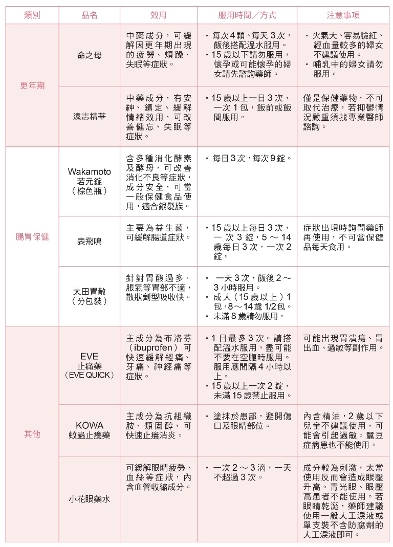 而最受到中年婦女歡迎的更年期藥物,如命之母等,是透過多種中藥配方,緩解更年期婦女常出現的症狀,如疲勞、煩躁、失眠。進入更年期的婦女,可以依照仿單,每日3次,每次4顆,並於飯後服用。但廖偉呈藥師提醒,若本身就是火氣大、易上火、臉容易發紅的民眾,並不適合服用命之母這種中藥配方藥物,可能會導致燥熱情況變嚴重,反而無法得到緩解症狀的療效。