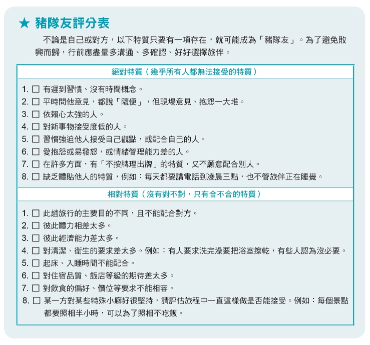出國旅遊最怕旅伴意見不合,敗興而歸,尤其是親友自助旅行,常會變成考驗感情的時刻。本文列舉幾種讓人避之唯恐不及的「豬隊友」特質,提醒讀者,不要成為別人眼中的旅遊黑名單!當然,自己也要「找對人」一起旅行,才能為旅途留下美好回憶!
