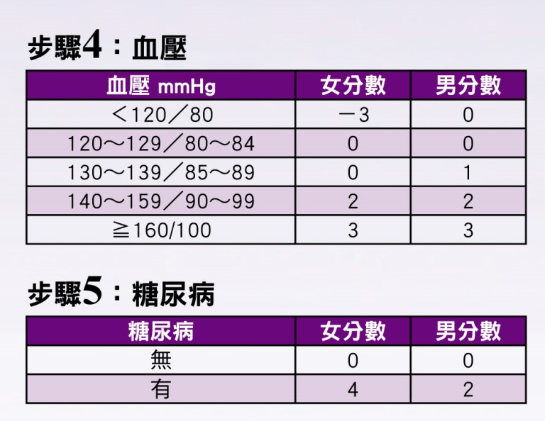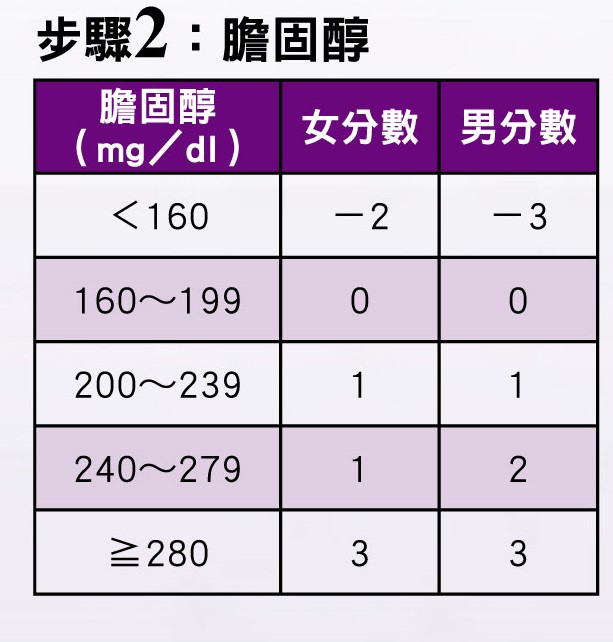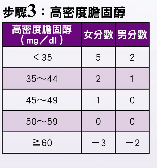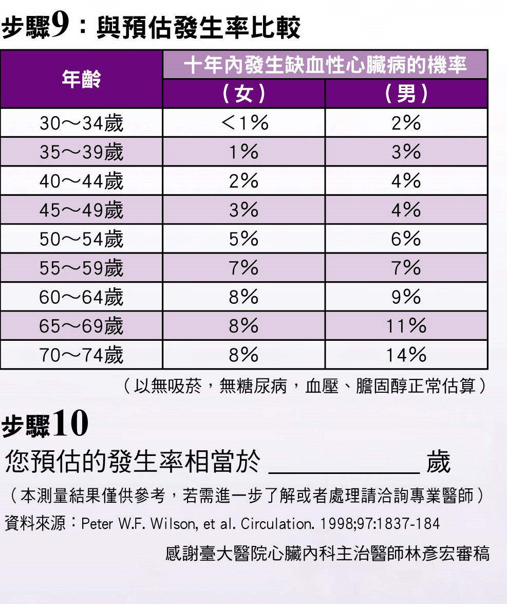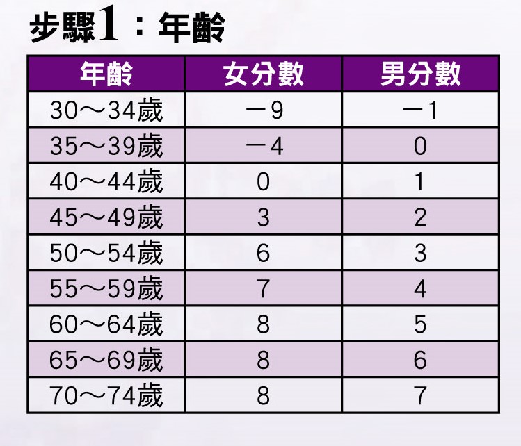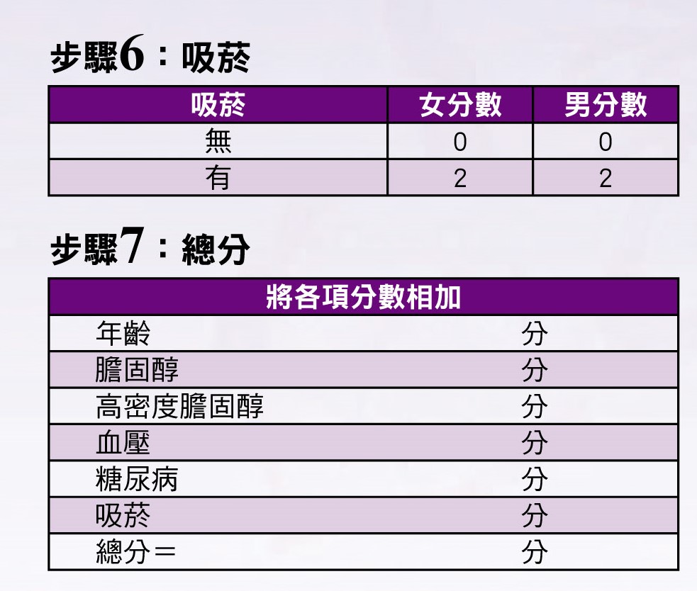 評分表中,有年齡、膽固醇、高密度膽固醇、血壓、糖尿病與否、吸菸與否,共6個項目,將6個項目的分數加總,即可依表得到自己未來10年可能發生缺血性心臟病的機率,再比對一般的預估發生率,即可得知自己是否屬於高危險群。