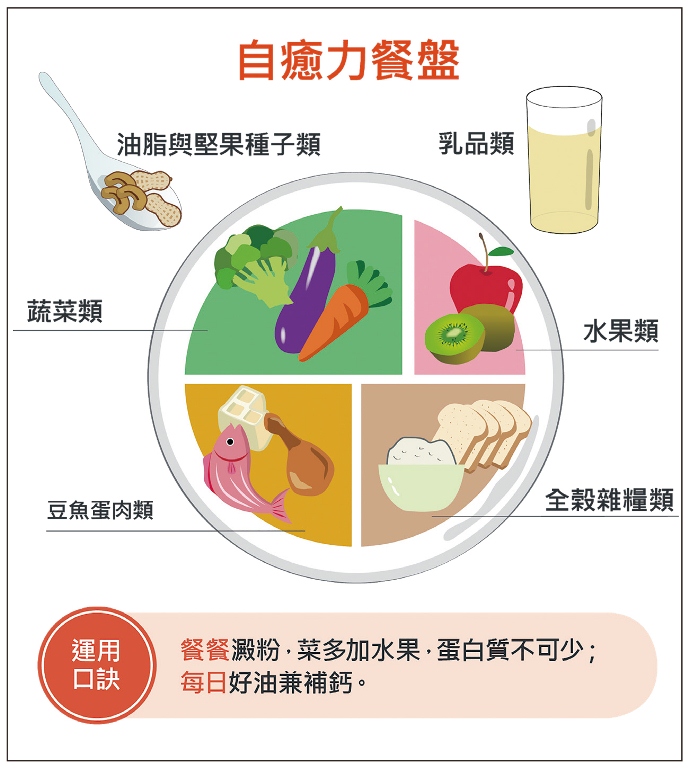 以飲食內容的學習為例,首先要把牙口整理好,至於每一餐的「餐盤」內該放哪些食物,必須簡單好記,所以可以簡化成蔬菜、水果、全榖雜糧、豆魚蛋肉,再加上牛奶及堅果共六大類(見自癒力餐盤圖),其中全榖雜糧、豆魚蛋肉各占餐盤下方1/4,蔬菜占2/3,水果占1/3,外加牛奶及堅果各一份。